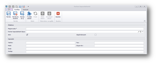 | Partner kapcsolattartó típus: | a partnerünk típusát, titulusát választhatjuk ki. A típusokat előre rögzíthetjük törzsadatként, de a lista folyamatosan szerkeszthető, bővíthető. |