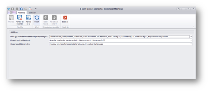 | Összehasonlítás művelet: | Pénzügyi követelés/kötelezettség ezzel kezdődik (I/N) / Kivonat sor ezzel kezdődik (I/N) / Pénzügyi követelés/kötelezettség tartalmazza (I/N) / Kivonat sor tartalmazza (I/N) |