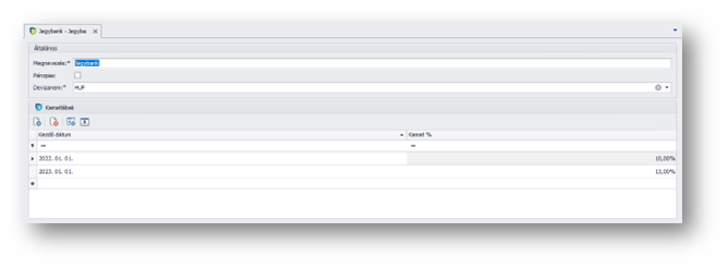Az egyik ilyen típus a jegybanki alapkamat. Az alapkamat mértékét és érvényességi kezdő dátumát a felhasználónak kell rögzíteni. A kiválasztott bizonylatokra futtatott késedelmi kamatszámítást - az egyéb beállítások mellett - az itt rögzített kamatlábbal fogja a program elvégezni.