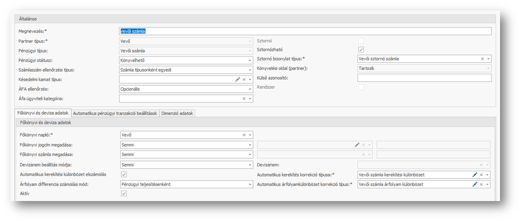 Pénzügyi számla rögzítéséhez szükséges a számla típusok definiálása. Pénzügyi számla lehet vevői és szállítói partner típusú, normál illetve sztornó típusú.