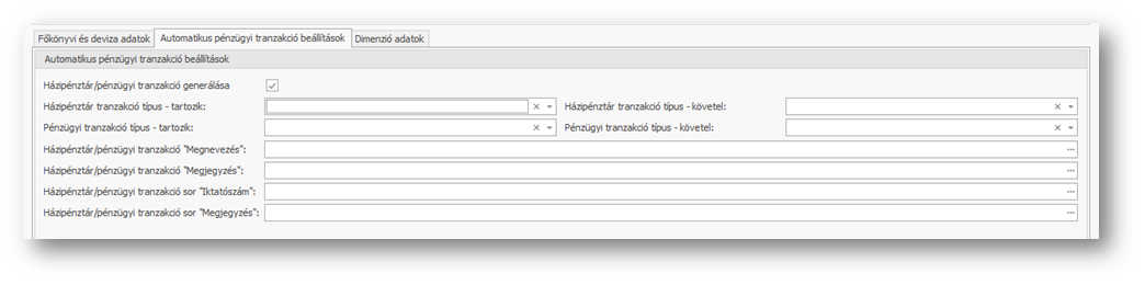 Házipénztár tranzakció típus - tartozik: Amennyiben a pénzügyi számlánál házipénztár típusú pénzeszköz van kiválasztva, a tranzakció tartozik oldal esetén ezzel az értékkel fog leképződni.