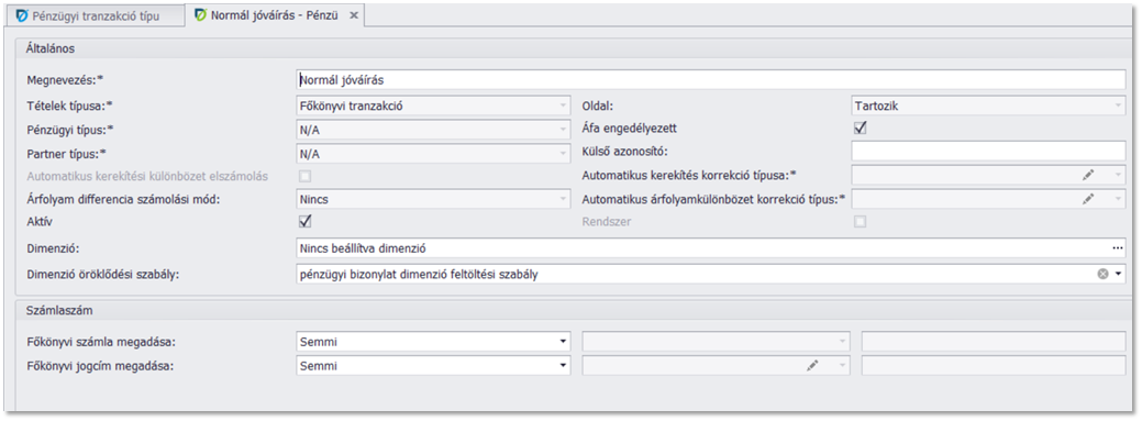 | Főkönyvi tranzakció: a tranzakcióban a tétel rögzítése főkönyvi számlaszáma történik. A tranzakció típusban beállítható az alapértelmezett főkönyvi számlaszám vagy jogcím, akár kötelező jelleggel is. Aktívvá válik az Áfa engedélyezett mező, valamint beállítható, hogy mely oldalra történjen a könyvelés. Árfolyam differencia elszámolási mód és kerekítési különbözet elszámolás ezen tranzakció típusnál nem értelmezhető. |