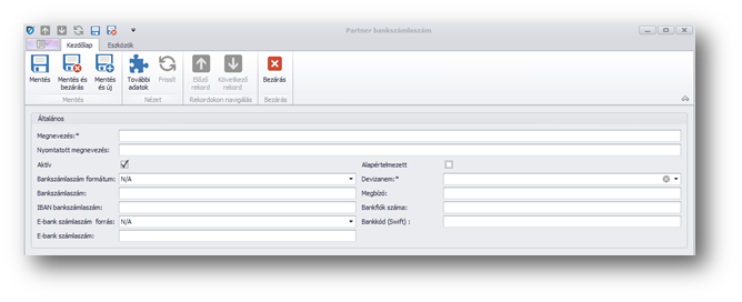 | Devizanem: | a partnerhez tartozó bankszámlaszám deviza neme. Törzsadatból választható, de lehetőség van új devizanem rögzítésére is. |
