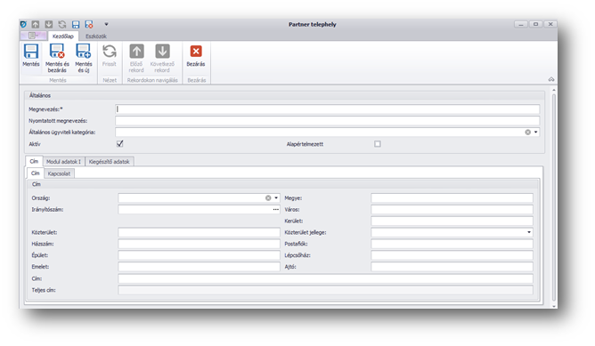 | Cím adatok: | a partner telephelyének teljes címét – ország, város, irányítószám, utcanév és házszám stb – rögzíthetjük. |