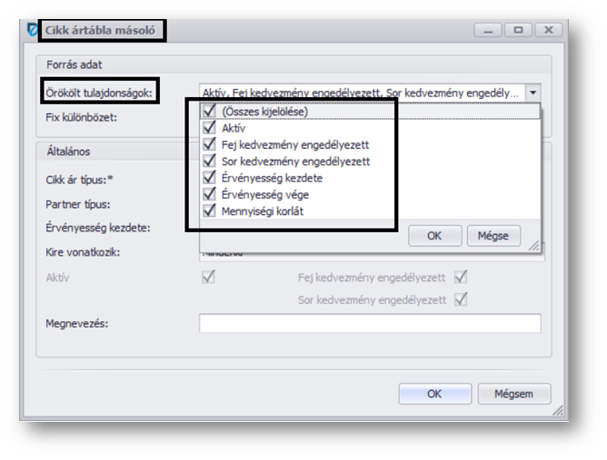 Ha másoláskor az öröklődő tulajdonságokat bejelölve hagyjuk, akkor az új ártábla ezeket a beállításokat megörökli abból, melyből létrehoztuk, és nem módosíthatók.