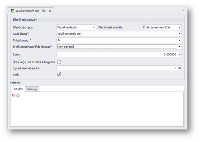 Példaként beállítjuk, hogy a vevői rendelésben 0 árú sor rögzítésekor figyelmeztessen a program.