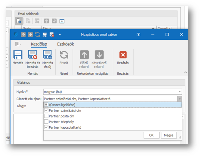 A sablon létrehozásakor megadható a Nyelv, illetve a Címzett cím típus mezőt lenyitva kiválasztható, hogy honnan vegye a program a címzett e-mail címét, vagyis melyik mail címre - akár több is jelölhető - küldje majd el a levelet..