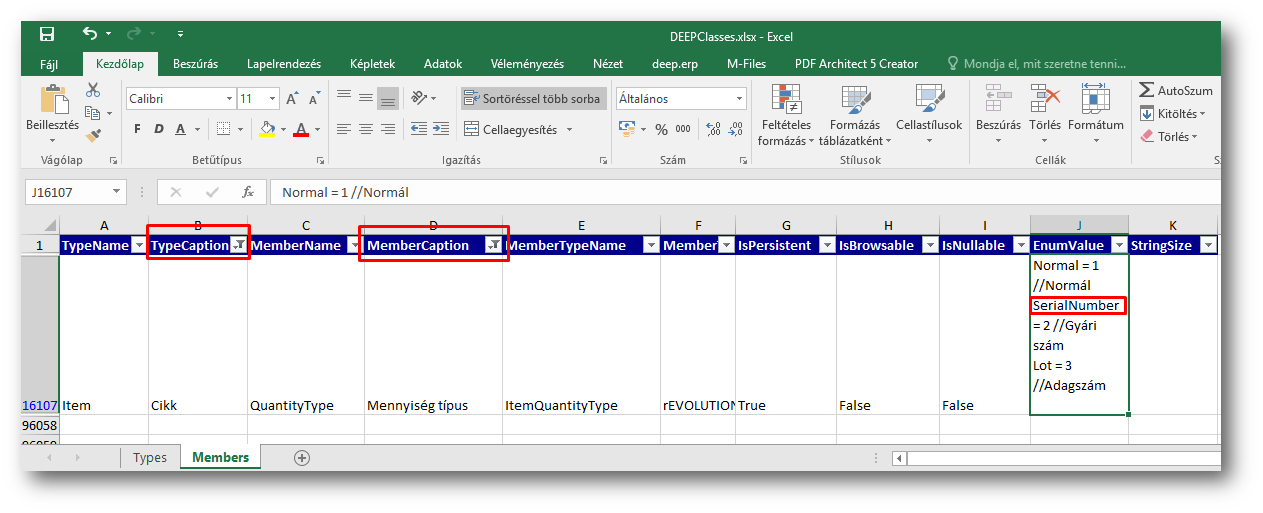 A Members munkalapon szűrve a TypeCaption-ra (Cikk) és a MemberCaption-ra (Mennyiség típus) az EnumValue oszlopból ki lehet nézni, hogy a programkódban hogyan hívjuk az enum-ot: SerialNumber