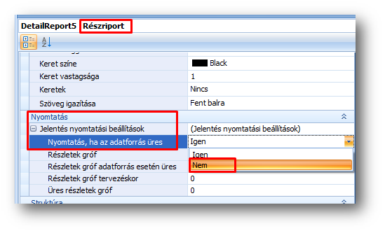 Egy részriporton állva a "Tulajdonság lista" ablakban a "Nyomtatás" területen található "Nyomtatás, ha az adatforrás üres" mezőben "Nem" értéket választva megadható, hogy, ha nem kap vissza adatot a részriport, akkor ne jelenjen meg és ne is foglaljon helyet.