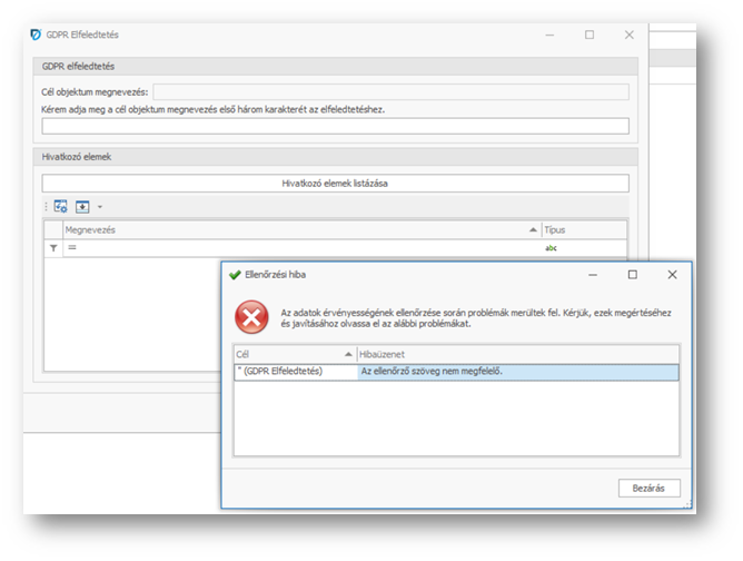 Amennyiben a Felhasználó általános adatainál a vezetéknév, középső név, keresztnév mezőkben (teljes név) nincs rögzítve karakter, akkor nem engedi elfeledtetni a felhasználót mivel az ellenőrző szövegben nem lesz elegendő karakterszámú beviteli adat. Ebben az esetben "Az ellenőrző szöveg nem megfelelő" üzenetet kapjuk.