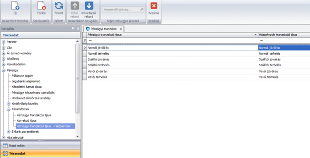 Törzsadat / Pénzügy / Paraméterek / Pénzügyi tranzakció tíőus és házi pénztár tranzakció típus megfeleltetés