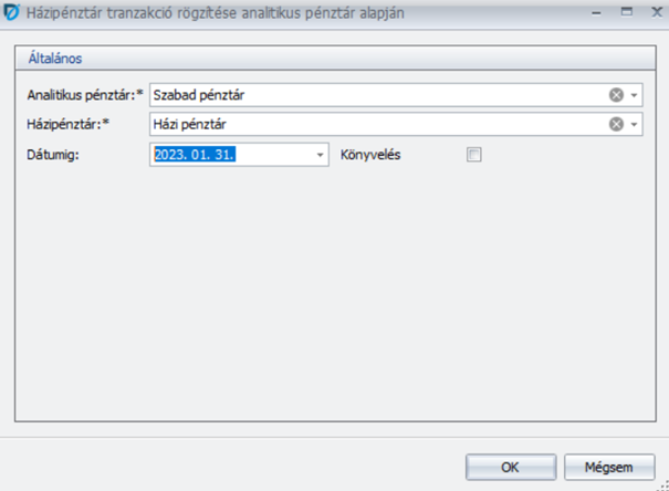 Az analtikus pénztárban könyvelt bizonylatokból végdátum megadással házipénztár generáltatható, amellyel biztosított hogy utólagosan generáltassunk házi pénztár bizonylatot a korábban lekönyvelt pénztári tételekből.