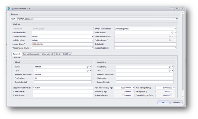 | Gépjárművezető neve: | Sofőr neve. A kiválasztott Szállító jármű törzsadatai alapján előtöltődik, de módosítható. |