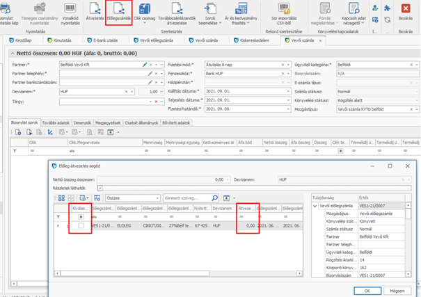 Az átvezető felületen ki kell választani, hogy melyik előleg számlából készítjük a végszámlát. Ezt megtehetjük a sor kijelölésével, a sor elején levő jelölő négyzet használatával. Ebben az esetben az Átvezetett nettó összeg oszlop értéke automatikusan kitöltődik a Nyitott nettó összeggel.