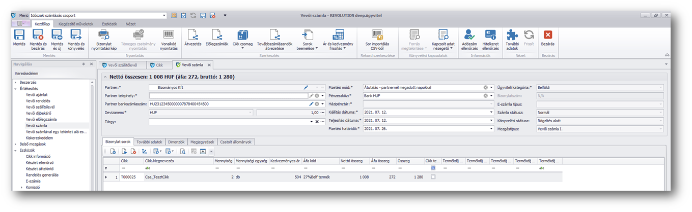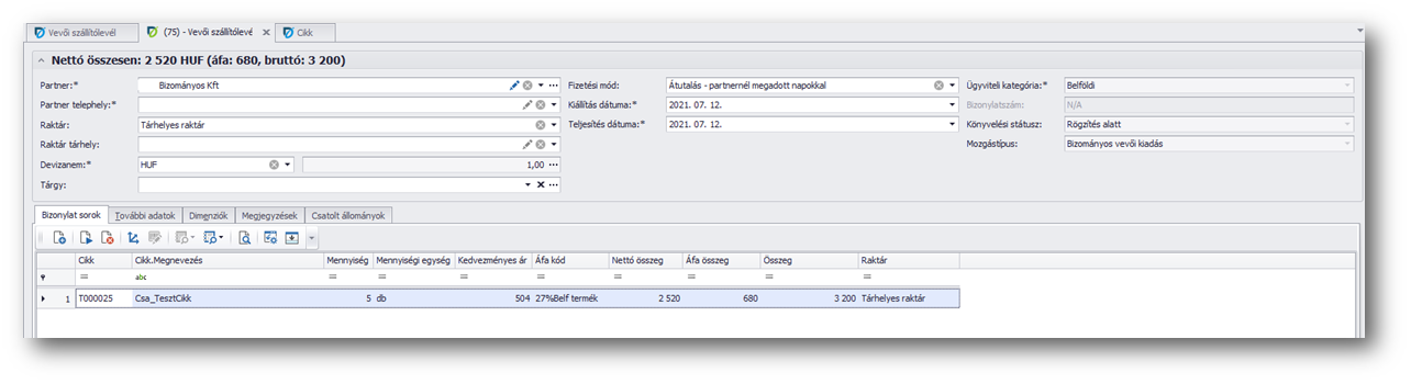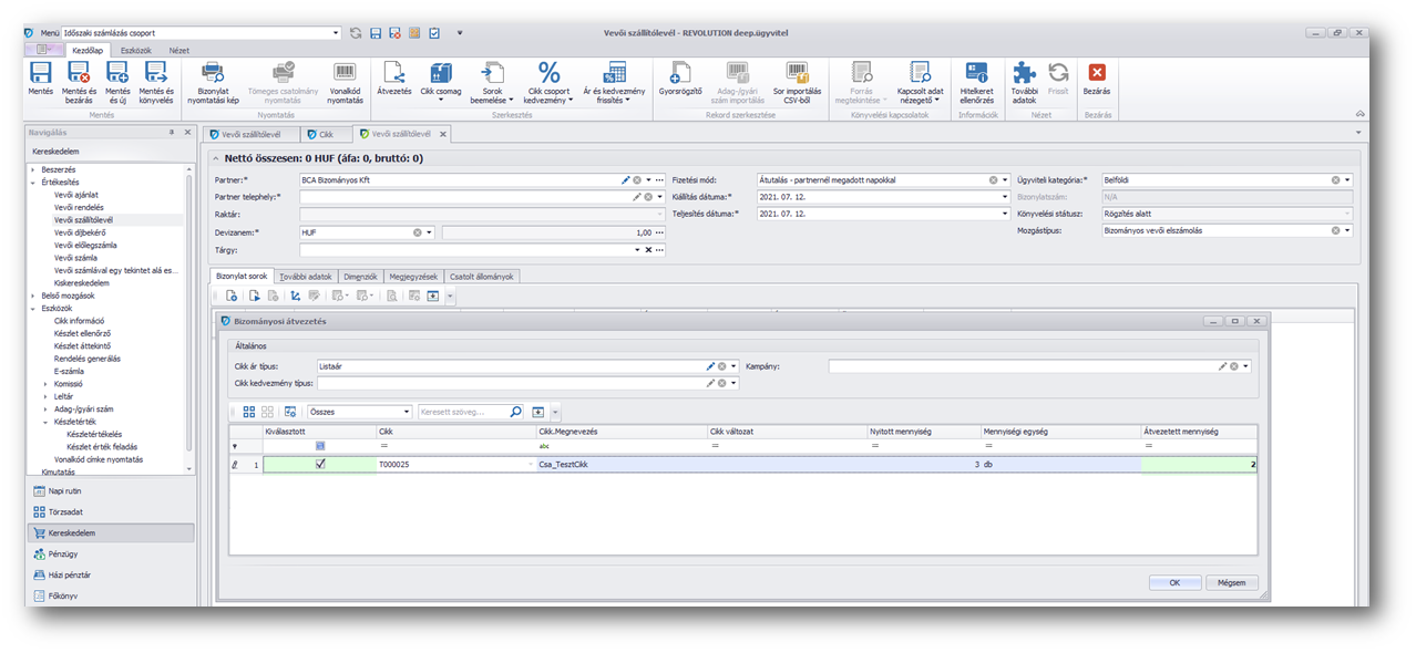A megjelenő még nála lévő mennyiségből megadjuk, hogy milyen mennyiségű termékkel kíván elszámolni. A bizományos vevői elszámolás szállítólevél alapján elkészíthetjük a vevői számlát (a bizományos felé), így ekkor történik meg a bizományoshoz kihelyezett és általa eladott áru részére történő kiszámlázása.