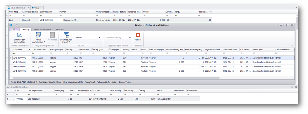 Lefuttatva a készletértékelést és a Készletérték feladást a főkönyvön is megjelenik a készletmozgás főkönyvi vonzata.
