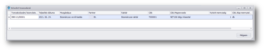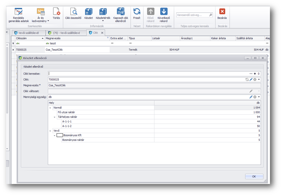 A Vevő funkcióban a Készletérték művelettel tudjuk ellenőrizni, hogy a vevőnél van-e bizományosi elszámolatlan készlet.