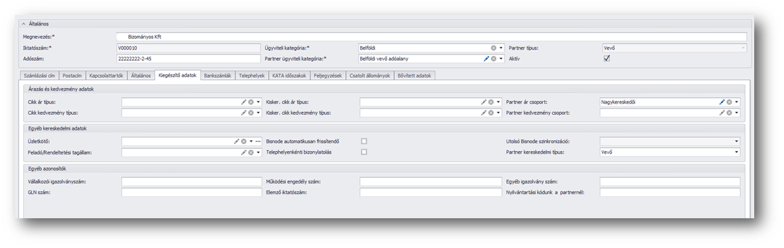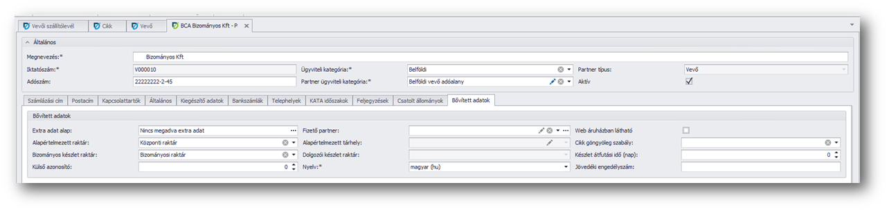Ehhez előzetesen fel kell venni a vevőtörzsbe a bizományos vevőinket úgy, hogy beállítjuk rájuk a "Partner kereskedelmi típus" mezőben, hogy "Vevő", valamint a bővített adatok lapfülön meg kell azt is adni a "Bizományosi készlet raktár" mezőben, hogy mely raktárt tekintjük a bizományos raktárának. A bizományosnak fixen ez lesz a raktára. Nem kell annyi raktárat felvenni, ahány bizományosunk van, hanem elég egy bizományosi raktár, mert abban vevőnként fogjuk látni a készletet.