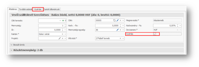 A folyamat normál bizonylat rögzítéssel indul, a bizonylat soroknál kiválasztva a cikket, jelölni kell, hogy a kiszállítás gyártással egy időben valósul meg. Így megjelenik egy új tab fül – Gyártás – ahol a termelést érintő adatokat beállíthatjuk. Az alapértelmezetten megjelenő értékek természetesen módosíthatók, csakúgy, mint az alapanyagok illetve a mennyiségek. A bizonylat soron rögzített cikk a megadott mennyiséggel teljes egészében kiszállításra kerül.