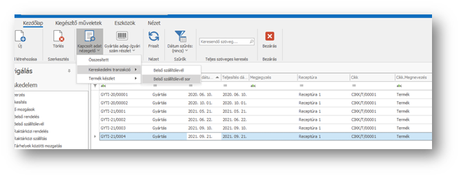 Az áttekintőn, egy-egy gyártási tételt kiválasztva, a kapcsolt adat nézegetővel megtekinthetjük a készletmozgást tartalmazó belső szállítólevél bizonylatokat.