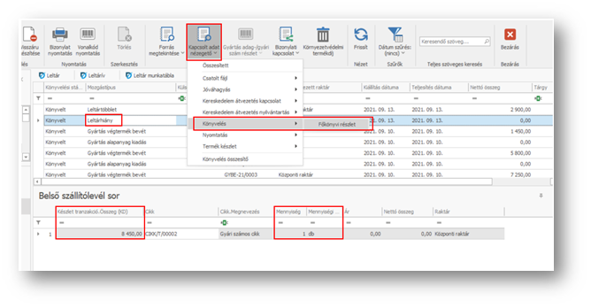 Leltárhiány könyvelésének megnézése a belső szállítólevél funkcióban: