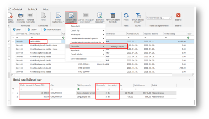 Leltártöbblet könyvelésének megnézése a belső szállítólevél funkcióban: