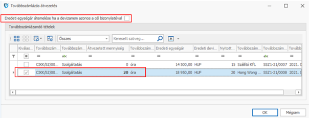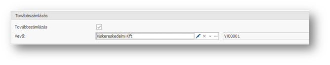 Kereskedelmi vevőszámla felvételekor, a menüsorban található Továbbszámlázandók átvezetése művelettel kiválasztható, hogy mely szállítószámla tételt kívánjuk továbbszámlázni. Választáskor a megjelenő ablakban kell a számlázandó sorokban bepipálni a "Kiválasztott" mezőt. Az "Eredeti egységár átemelése, ha a devizanem azonos a cél bizonylatéval" pipával jelölhetjük, hogy átemelődjön-e az ár.