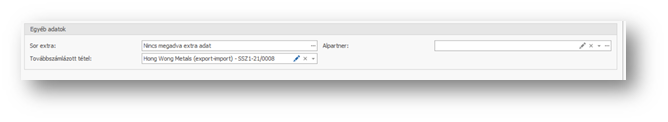 A kiválasztott szállítószámla tétel adatai átkerülnek a vevőszámla tételbe, valamint a További adatok tab fülön kitöltődik a forrás szállítószámlát tartalmazó "Továbbszámlázott tétel" mező is.