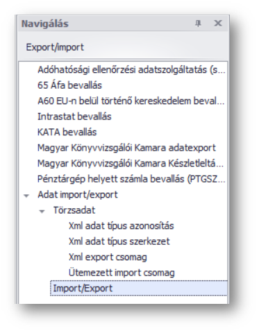A szokásos menüpontból kell elindulnunk, a Export-Import / Adat import/export / Export-Import.