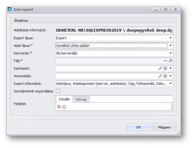 Meg kell adnunk az Adat típusát, ami ebben az esetben vonalkód jegyzék, majd megadni a Fájl levét, esetleg valamilyen szűrési feltételt, majd az OK gombbal exportálni: