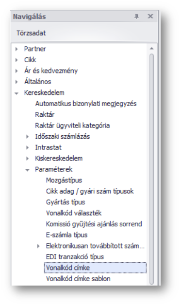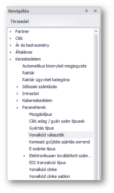 A menüpontot a Törzsadatok / Kereskedelem / Paraméterek / Vonalkód választék menüpont alatt találjuk meg: