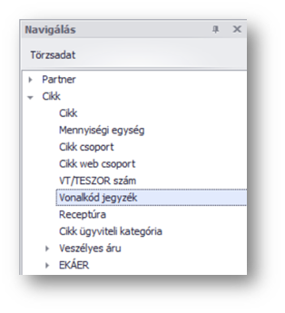 Ha felvettük a választékot, akkor utána legenerálhatjuk a vonalkódot. Ehhez el kell mennünk a Törzsadatok / Cikk / Vonalkód jegyzék menüponthoz.