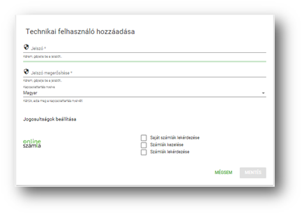 Itt az „Új felhasználó”-ra kattintva juthatunk át a “Technikai felhasználó” hozzáadását támogató felületre. Itt történik meg a Technikai felhasználói oldal hozzáadása, ennek véglegesítéséhez jelszó megadása kötelező. A technikai felhasználó jogosultsága kizárólag az Online Számla felület adatszolgáltatás teljesítésére terjed ki.