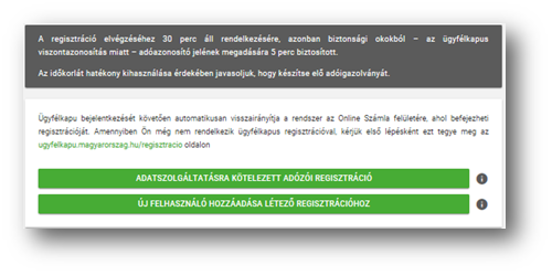A megjelenő ablakon az „Adatszolgáltatásra kötelezett adózói regisztráció” panelre kattintva megkezdődik a tényleges regisztráció. Fontos, hogy az adatkezelési tájékoztatóra vonatkozó checkbox jelölve legyen. A felület az ügyfélkapu regisztrációval rendelkező felhasználókat azonnal az Ügyfélkapu felületre navigálja, majd azonosítás után visszanavigálja az online számla oldalra ahol megkezdődhet az adatszolgáltatásra kötelezett adózói regisztráció.