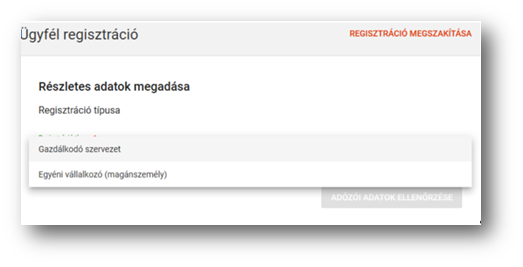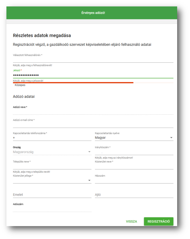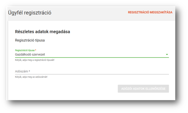 Gazdálkodó szervezet esetében az adószám, Egyéni vállalkozó (magánszemély) esetén adószám és adóazonosító jel megadása szükséges. Az adószám megadását követően a regisztrációs felületen előtöltődnek a gazdálkodó szervezetről, vagy egyéni vállalkozóról ismert adatok. Amennyiben a regisztrált személynek nincs képviseleti joga a megadott adózóra vonatkozóan, a rendszer hibaüzenetet küld. A folyamatot a „Regisztráció” gombra kattintással zárjuk.