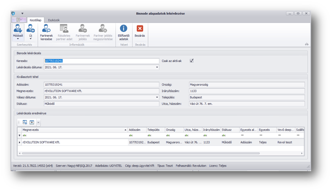 A keresés mezőbe írhatjuk be, amit keresni szeretnénk, Nem csak adószámot adhatunk meg, hanem szöveget is. A megadott keresése feltétel alapján keres a program az adószámba, csoportos adószámba, a címben és a névben valamint most már a DUNS számok között is. Az első 10 találatot adja vissza a lekérdezés eredménye részen. Ha vevő vagy a szállító menüpontban indítottuk el a keresést, akkor a partner adatai alapján próbál keresni.