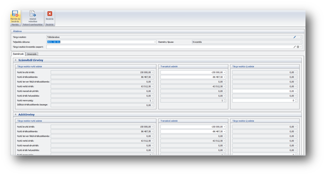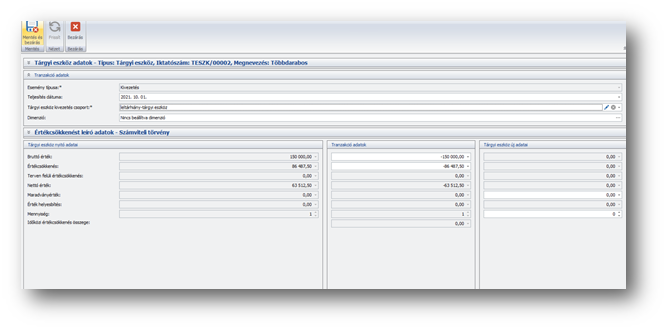 A Tárgyi eszköz Tranzakció adatok részbe beleírja az eszköz aktuális értékét. Ha értékcsökkenési elszámolási időszak közben értékesítünk, kiszámolja az értékesítésig esedékes értékcsökkenést. Amennyiben az eszköz több darabos, a mennyiség mező változtatható, ellenkező esetben az értéke 1 és nem változtatható.