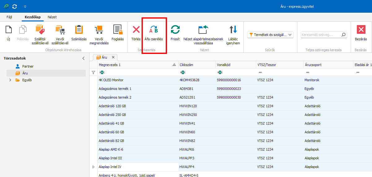 Az express.ügyvitel programban nagyon egyszerűen cserélhetjük le több áru áfáját.