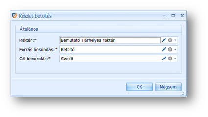 A betöltési folyamat célja, hogy azonos raktáron belül a „szedési” helyeket betöltsük a „betöltő” helyről. Ez a gyakorlatban azt jelenti, hogy a magasabb prioritású raktárhelyről készletet mozgatunk az alacsonyabb prioritásúra. A funkció figyelembe veszi azokat a tárhelyeket is, melyeknél a komissióból kizárt jelölés igaz.
