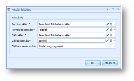 Cél raktár: A feltöltés célraktára, ahova betöltjük a készletet.