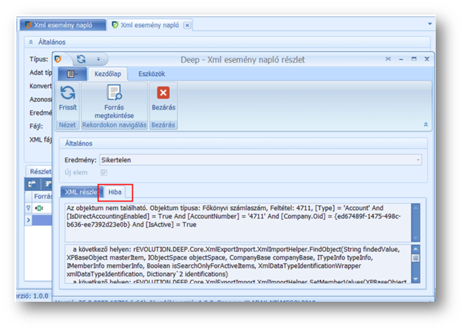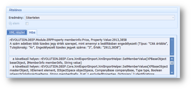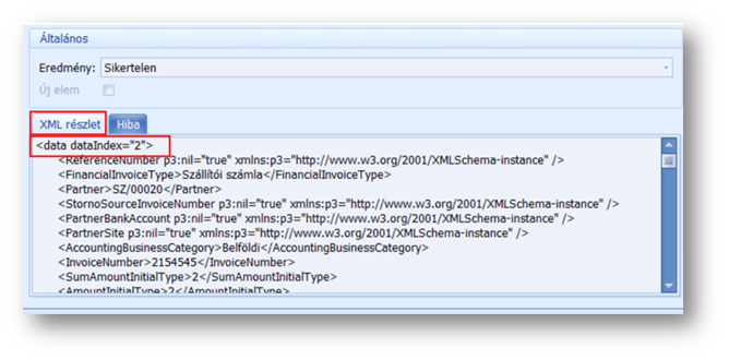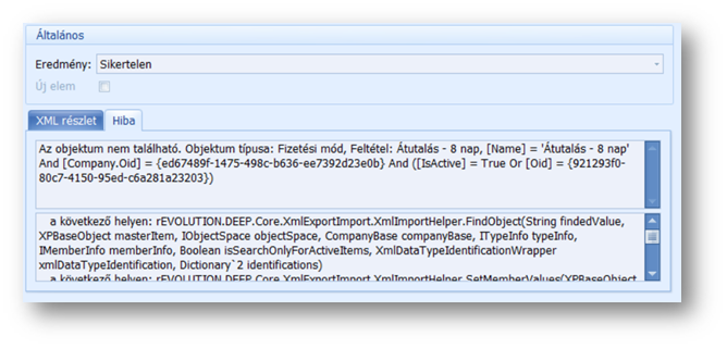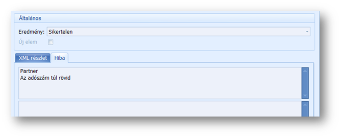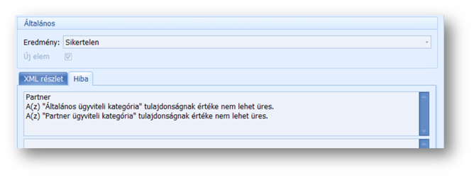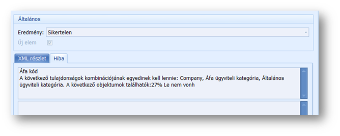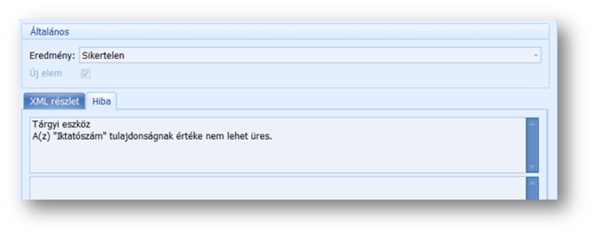 Előfordul olyan eset is - mint a fenti képen -, hogy a sikertelen elemszám 0, az eredmény mégis sikertelen státuszt kap. Bármelyik eset áll fent, a hiba okát az Xml esemény naplóban, az érintett sort megnyitva, a Hibaleírás tabfülön találjuk.