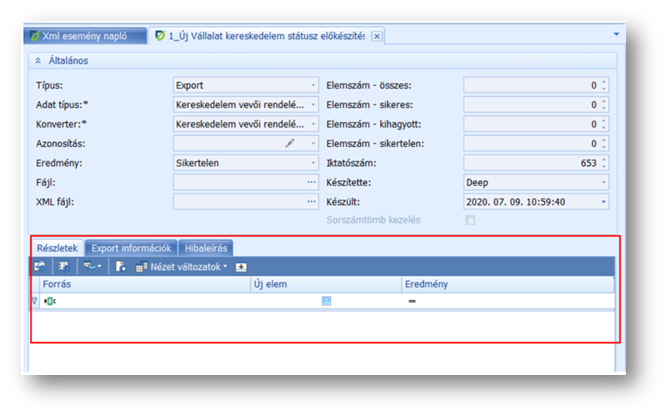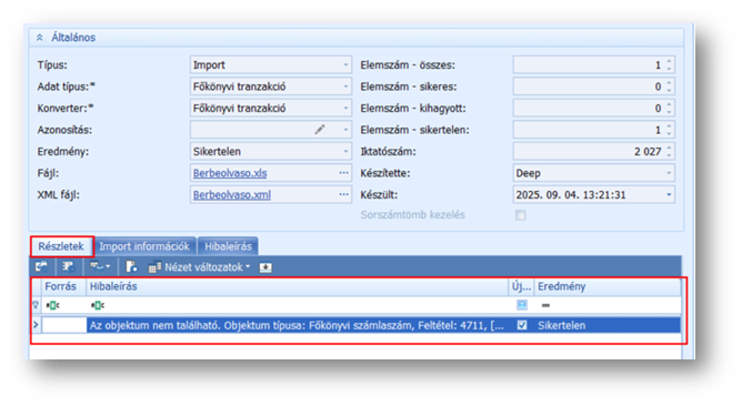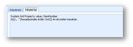 Sikertelen import esetén a hibás elemszámokat az Xml esemény naplóban, az érintett sort megnyitva, a Részletek tabfülön találjuk. Az áttekintőre oszlopválasztóval kitehető a Hibaleírás oszlop, melyben látható a hibaüzenet.