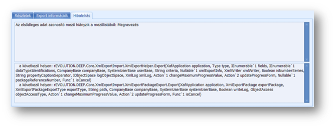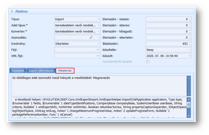 Amennyiben az export vagy import sikertelen és a Részletek tab fülön nincs hibás sorbejegyzés, minden esetben nézzük meg a Hibaleírás tab fület is.
