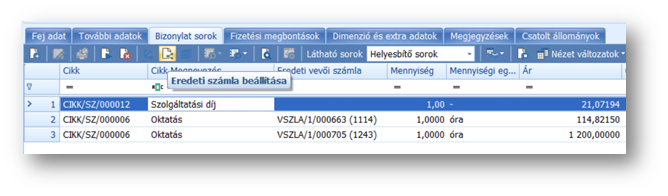 Az így létrehozott helyesbítő számlába nem csak a listából választhatunk tételeket, hanem manuálisan is rögzíthetünk további jóváírási sorokat. Ebben az esetben az így létrehozott sort kijelölve, meg kell adni melyik volt az eredeti számlán, amelynek a tételét helyesbítjük. Ezt a menüsorban található Eredeti számla beállítása funkcióval tehetjük meg.