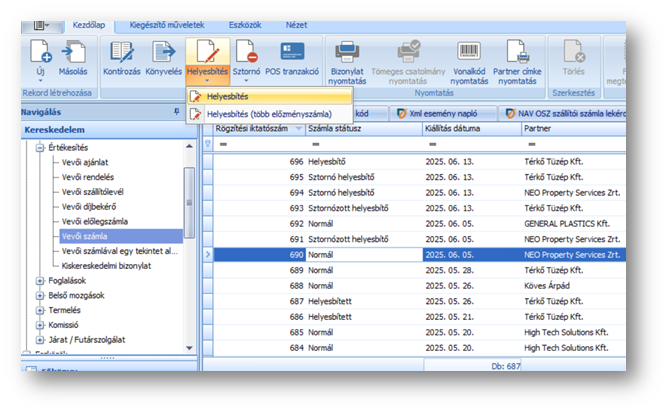 A rendszerben lehetőség van a vevői számlák helyesbítésére az alábbi két módon: