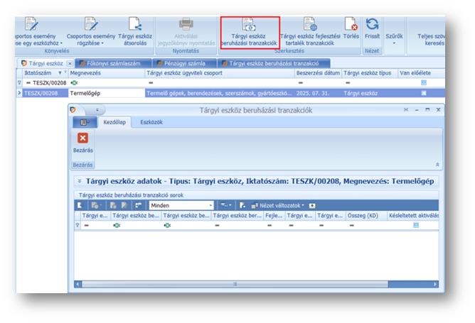 1) A tárgyi eszköz menüpont áttekintőn keressük meg az érintett tárgyi eszköz kartont, majd kattintsunk a menüsorban található Tárgyi eszköz beruházási tranzakciók menüpontra.