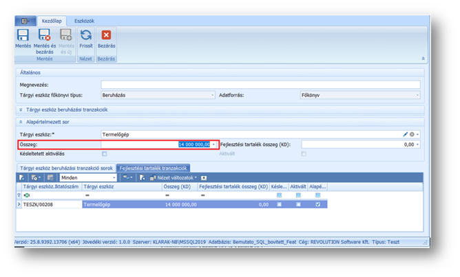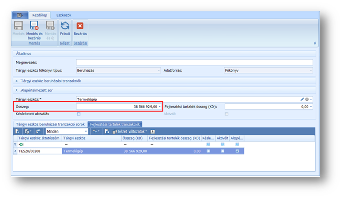 Az Összeg mezőben írjuk át az összeget arra, amely a teljes beruházási tranzakcióból az érintett tárgyi eszközhöz tartozik, tehát amely összeggel majd aktiválni szeretnénk. Mentés és bezárással véglegesítsük a hozzárendelést, és megtörténhet az eszköz aktiválása.