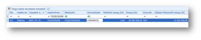 Ellenőrzésként a Tárgyi eszköz beruházási tranzakció menüpontban ezt a beruházási tranzakciót megkeresve, látható az eredeti tranzakció szerinti összeg (Összeg (KD)), és a már felhasznált, tehát tárgyi eszközhöz rendelt összeg (Előjeles felhasznált összeg (KD)).