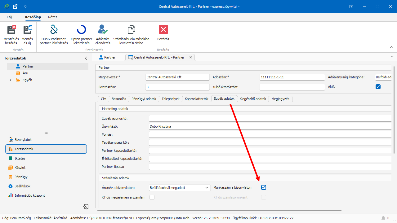 •Munkaszám bizonylaton: a nyomtatható sablonokon ezentúl akkor jelennek meg a munkaszámok, ha a partner adatlapján be van jelölve az Egyéb adatok fülön, illetve a bizonylat kiállításakor a termékhez választottunk Munkaszámot. A program beállításokban lévő partner alapértelmezési beállítások opciót már nem vesszük figyelembe.