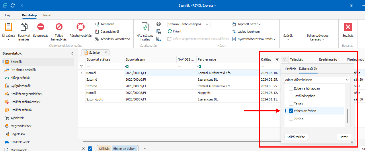 1.Először állítsuk be azokat a szűrési feltételeket, melyeket később szeretnénk elmenteni. Például a számláknál az oszlopfejléceken lévő kis szűrő ikonnal beállíthatjuk a kiállítási dátumra, hogy az idei számlákat mutassa. Az áttekintő alatt megjelenik a szűrési feltétel is.